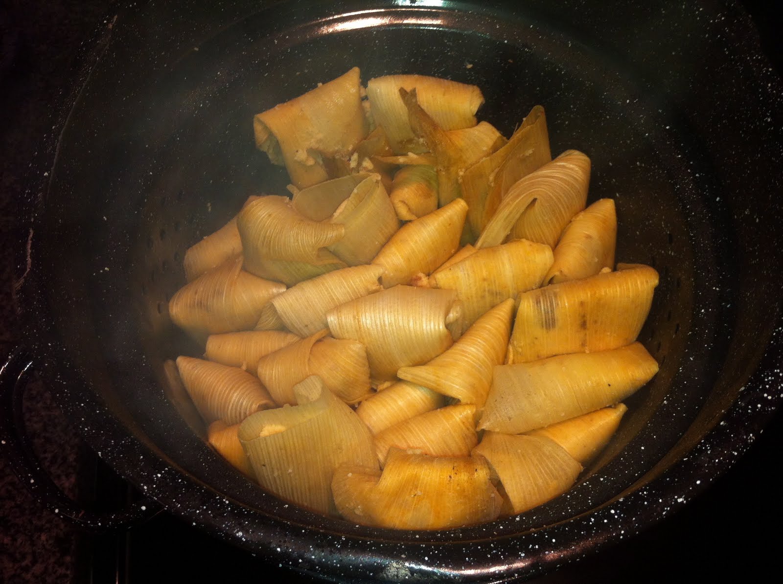 We started by soaking the husks for 45 minutes in warm water. No pictures of this. Put the husks in a pot and turn on the water from the sink. Add it to the pot. Let them soak.
